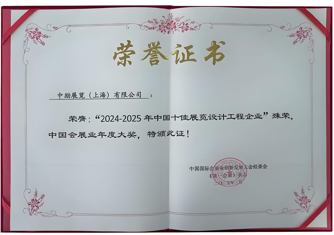 在剛剛落幕的2024-2025年中國國際會展業(yè)創(chuàng)新發(fā)展大會上,中勵展覽憑借卓越的設(shè)計(jì)實(shí)力與創(chuàng)新精神,榮獲“中國十佳展覽設(shè)計(jì)工程企業(yè)”稱號。這一殊榮不僅是對中勵展覽多年來努力的肯定,更是對公司在展覽設(shè)計(jì)領(lǐng)域持續(xù)創(chuàng)新的高度認(rèn)可。