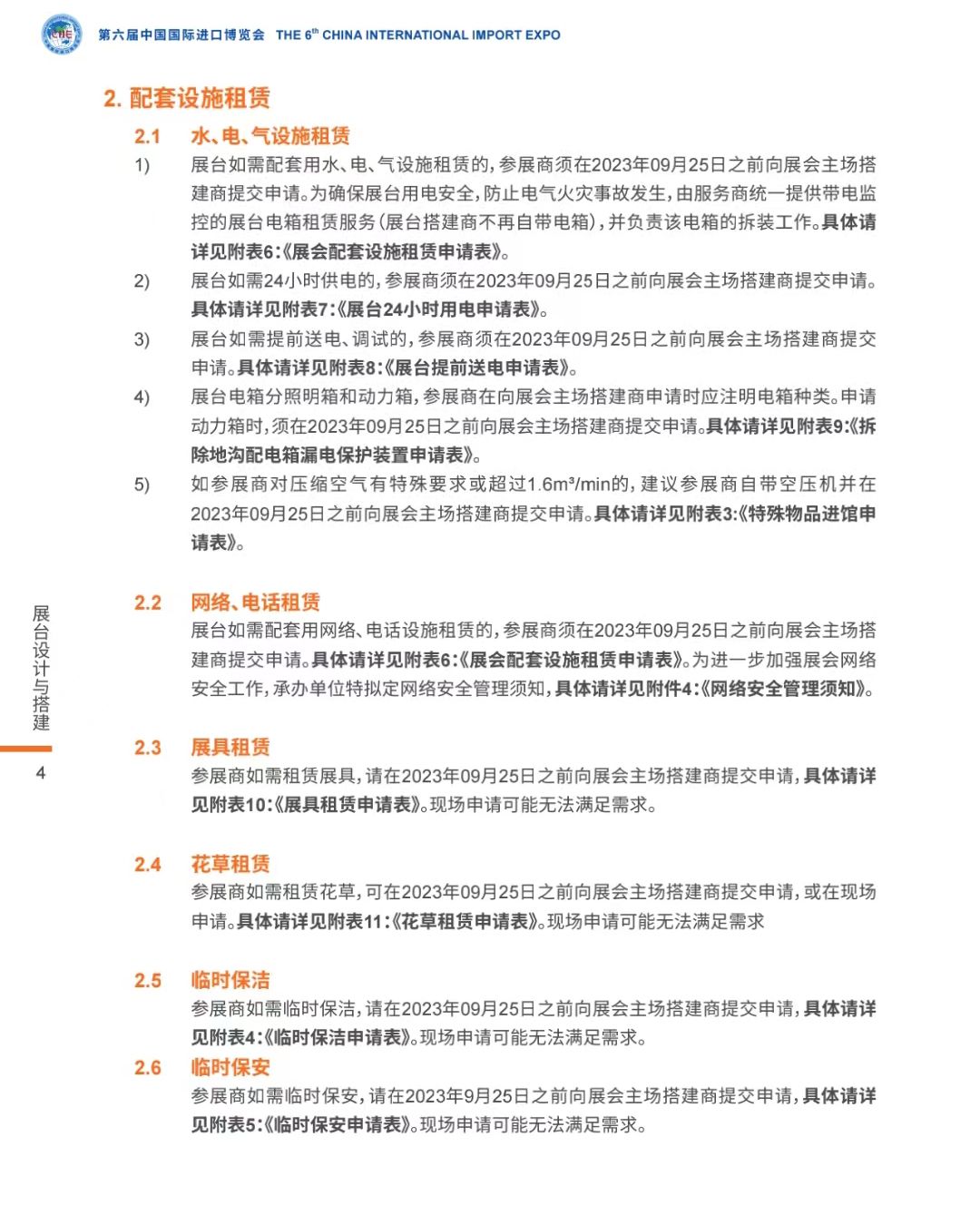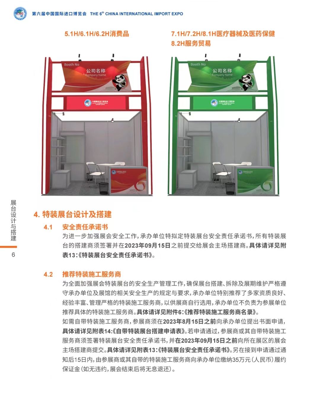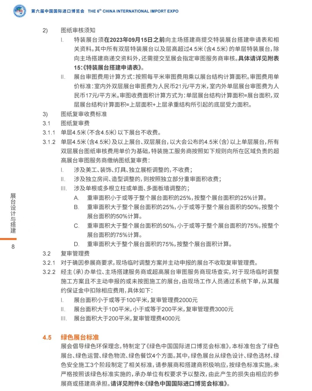 進博會持續(xù)倡導(dǎo)“綠色、環(huán)保、可持續(xù)”理念,引導(dǎo)參展企業(yè)將“環(huán)?!甭鋵嵲谛袆由?。除了技術(shù)裝備展區(qū)特設(shè)節(jié)能環(huán)保專區(qū)外,展前搭建也格外注重“綠色布展” 。要求展臺施工中盡可能減少對環(huán)境產(chǎn)生的負面影響,避免過度使用資源和能源,多使用“可循環(huán)利用”材料,鼓勵應(yīng)用新材料、新產(chǎn)品和新技術(shù),減少污染和廢棄物。實地搭建前,展商首先需提交詳細的展臺圖紙,包括展臺結(jié)構(gòu)圖、展臺效果圖和展臺材料圖等。以下是官方權(quán)威發(fā)布的展臺設(shè)計與搭建參展商手冊。