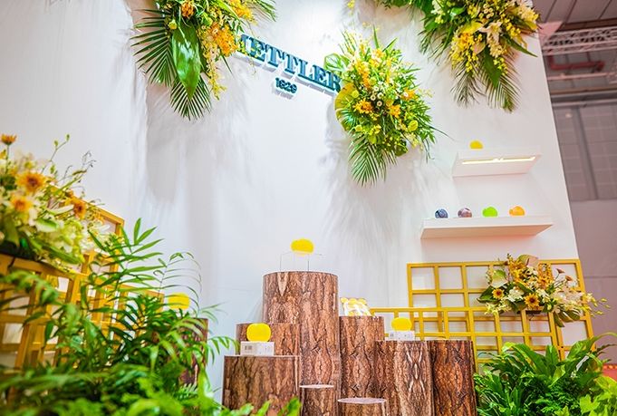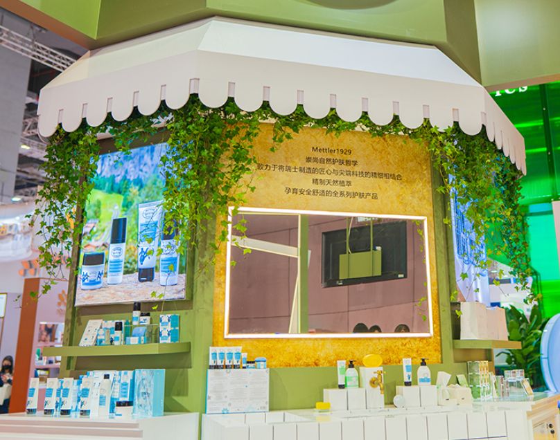 中勵展覽為了體現(xiàn)瑞士百年護膚品牌Mettler1929“萃自天然”理念,在展臺設(shè)計裝修方案中使用了大量稀缺的天然植物,如:紫羅蘭、天堂鳥、火焰蘭、山里紅、洋甘菊、情人草、跳舞蘭、洛新婦等等,還請來了專業(yè)的花匠按照品牌調(diào)性剪配植物,最終呈現(xiàn)了精致格調(diào)、天然去雕飾之展臺效果,獲得品牌方稱贊。